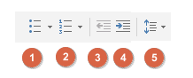 ① 글머리기호 ② 번호 매기기 ③ 목록 수준 줄임 ④ 목록 수준 늘림 ⑤ 줄간격 입니다
